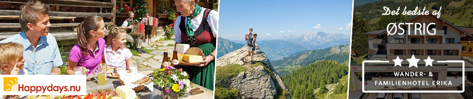 Forestil jer en vandreferie, hvor de allerbedste vandrestier begynder lige uden for jeres dør. Eller en sommerferie med familien, hvor byens imponerende vandland ligger bare 500 meter fra jeres hotel. Uanset hvad I drømmer mest om, finder I begge dele i Wagrain, der er en del af Salzburger Sportwelt – Østrigs alpine perle med nogle af landets allerfineste vandreområder og et væld af aktivitetstilbud. På det hyggelige Wander- & Familienhotel Erika står de på hovedet for, at I kan få det bedste ud af ferien: Her får I flere skønne måltider serveret og har en hyggelig base midt i byen at vende tilbage til efter dagens oplevelser. Med i pakken får I desuden det populære Salzburger Sportwelt Card, som giver jer eksklusive rabatter til områdets bedste seværdigheder og attraktioner.
